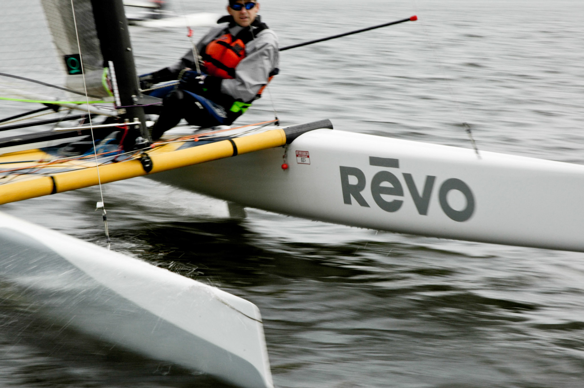 MAY 19, 2007 - GALESVILLE, MD, USA - Mike Krantz (GA) takes a moment to demonstrate what can happen when the leeward bow dives in while reaching to the offset mark - the classic pitchpole. Krantz was one of 30 catamaran sailors who competed in the 2007 Westfield Annapolis Mall A-Class Catamaran North Amercian Championships. - IMAGE BY ANDY HERBICK - ALL RIGHTS RESERVED.